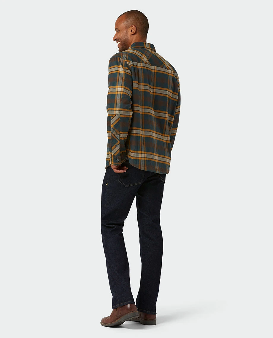 Straight-up flannel only goes so far in a Wyoming winter, which is why our Buckhorn adds Thermore® Ecodown® synthetic insulation. Lofted by location—with more fill in the body, less in the sleeves—the organic, brushed-cotton flannel rolls loose but packs tech warmth underneath. Worn over a tech tee, hoodie or even another flannel, it fires up outdoor-rated warmth during backyard bonfires, parking lot tailgates or campground jam sessions. Hidden chest pocket snaps lock in supplies while handwarmer pockets stow or stand in for gloves.