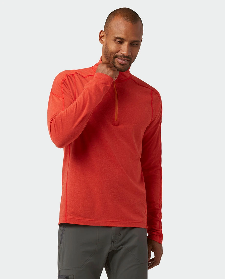 More relaxed confidence than athletic intensity, our Tipton Tech Half Zip blends technical drirelease® performance with a comfortable feel that ranges from training and traveling to rest and recovery. Heathered, jersey fabric feels super soft on bare skin yet enables active range with four-way stretch. Flatlock seams reduce chafe and thumbholes prevent unwanted rise when layering. A deep-venting front zipper dumps heat fast.